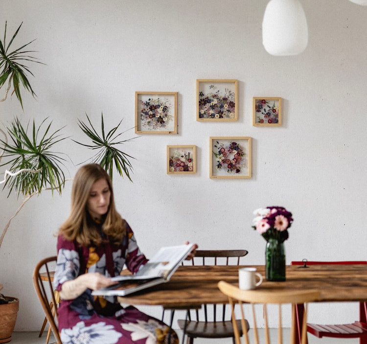V naší dílně vytváříme květinové a lesní obrázky, které ukládáme do ručně vyráběných dřevěných rámů.
