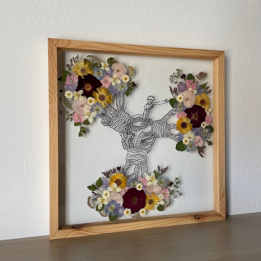 Květinový ručně vyrobený obraz s originální malovanou siluetou Malého prince s květy v modrých, žlutých a růžových barvách.