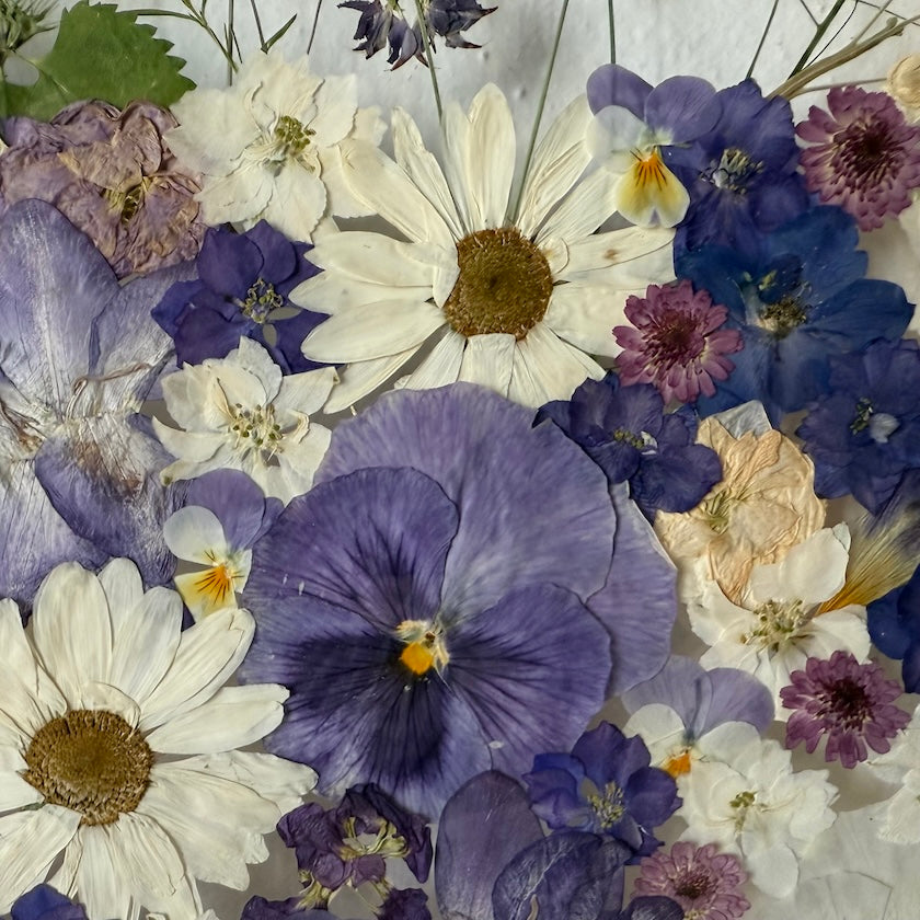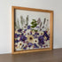 Květinový ručně vyrobený obraz s květy v bílých, modrých a fialových barvách, které rostou ze středu obrazu. Mezi květy najdete macešky, chryzantémy, ostrožky a mnoho dalšího.