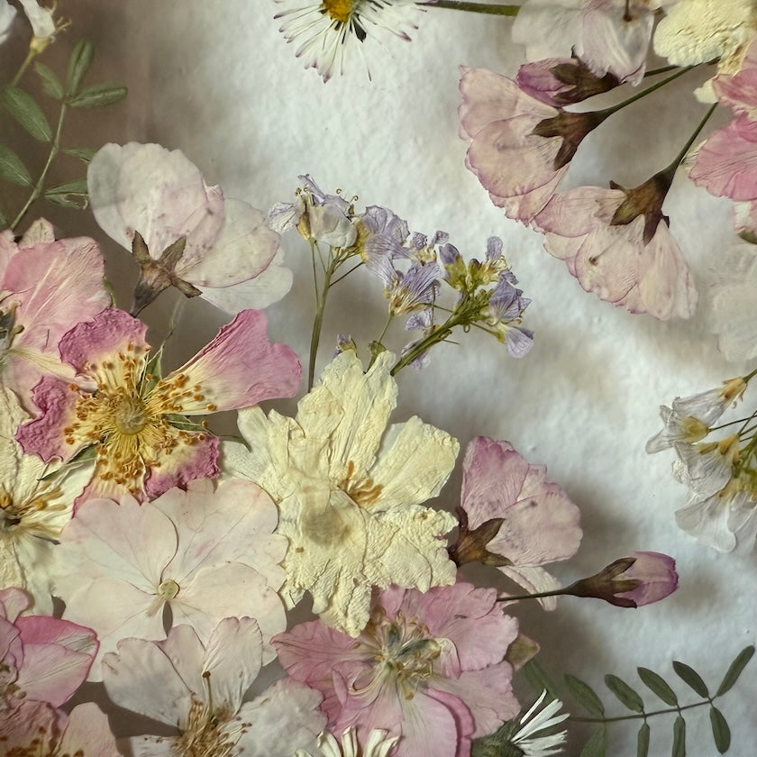 Květinový ručně vyrobený obraz s květy růžových a bílých barviček, které rostou z rohů obrazu. Mezi květy najdete růže, ostrožky, květy třešní a mnoho dalšího.