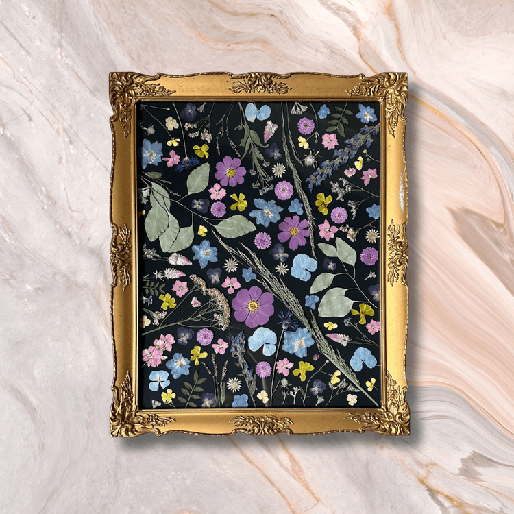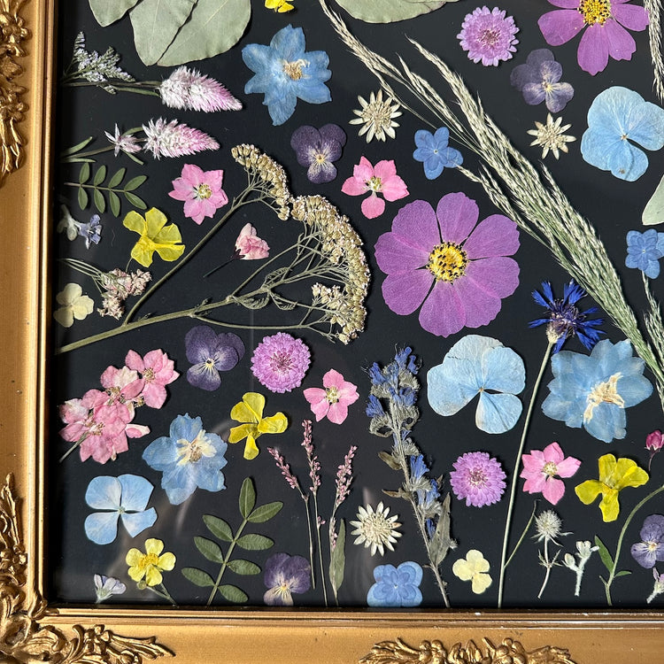 Květinový ručně vyrobený obraz je zarámovaný do starého rámu na černém podkladu.