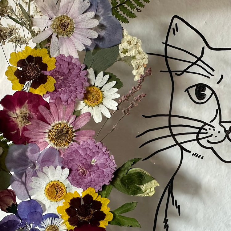 Květinový ručně vyrobený obraz s ručně nakreslenou siluetou zvířátka. Kočka z pravých květů zahřeje u srdce každého milovníka zvířecí a květinové říše. Pro malé i velké.