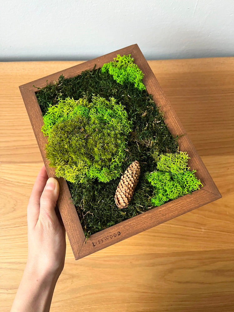 Ručně vyrobený obraz s nadýchanými chomáčky několika druhů mechu.