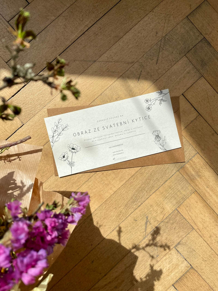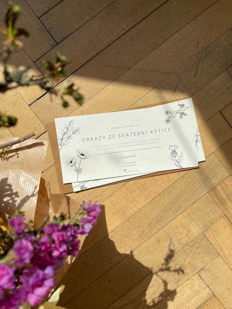 Jdete na svatbu a nevíte si rady se svatebním darem? Darujte náš poukaz na vylisování a zarámování svatební kytice. Je to velmi originální dar, který potěší každou ženu a vytvoří ji krásnou vzpomínku na její svatební den.