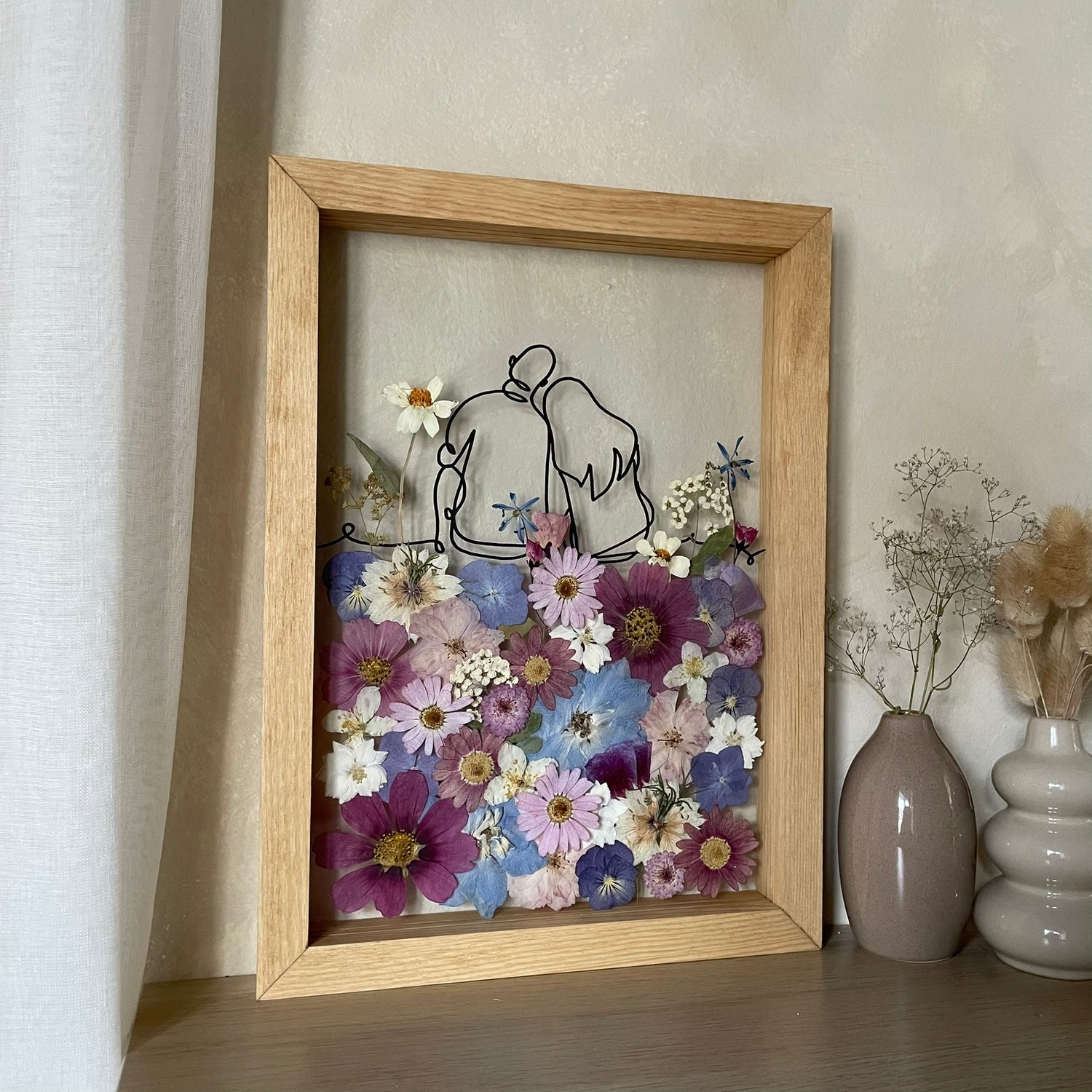 Květiny jsou zasazeny mezi skla a doplněny ručně vyráběným dřevěným rámem, který vzniká přímo v naší dílně. 🪵