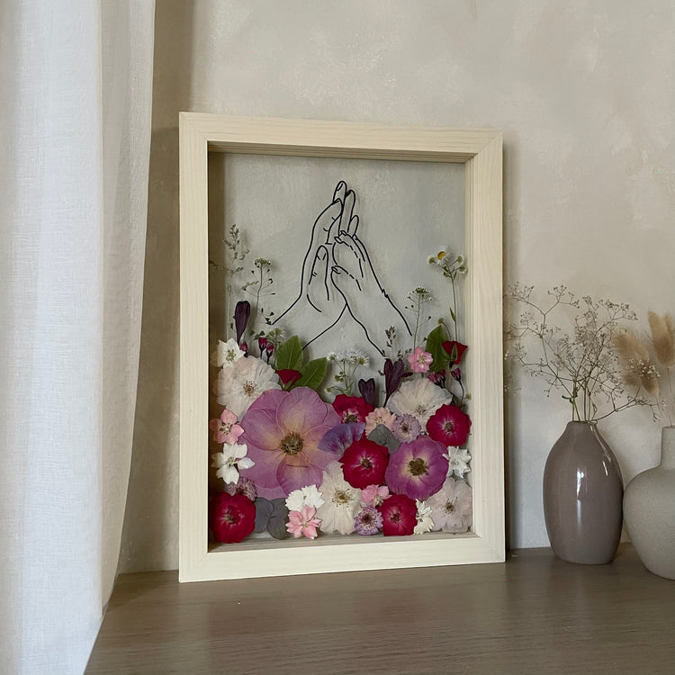 Květiny jsou zasazeny mezi skla a doplněny ručně vyráběným dřevěným rámem, který vzniká přímo v naší dílně. 🪵