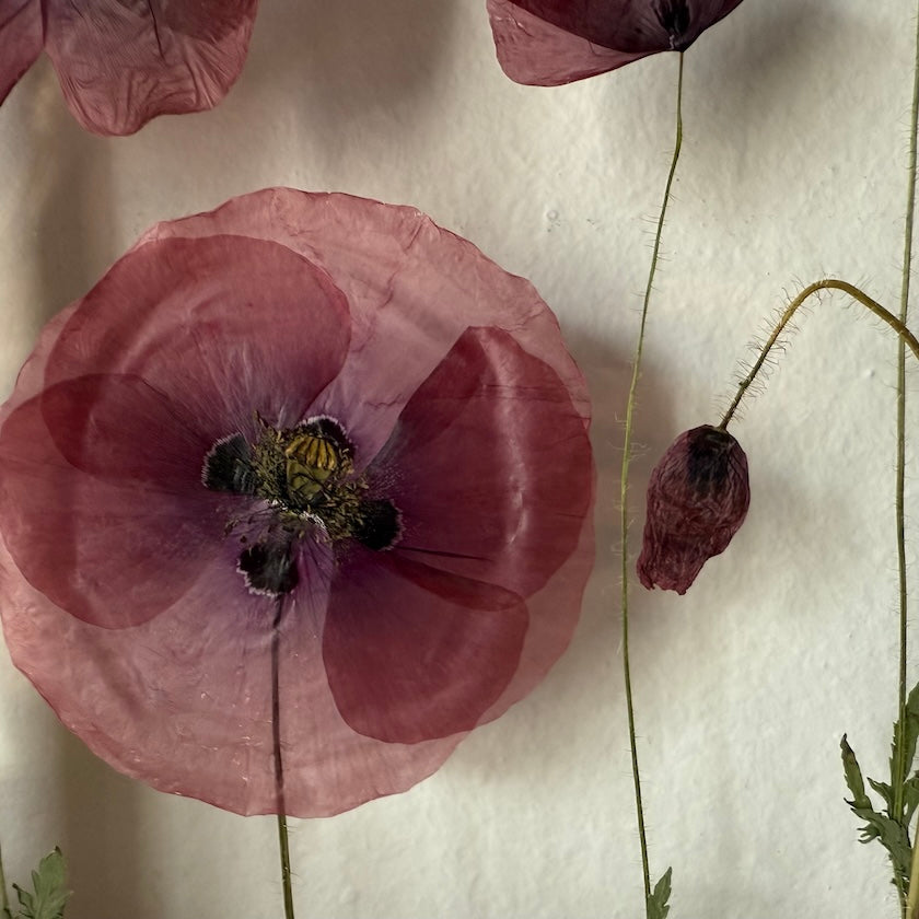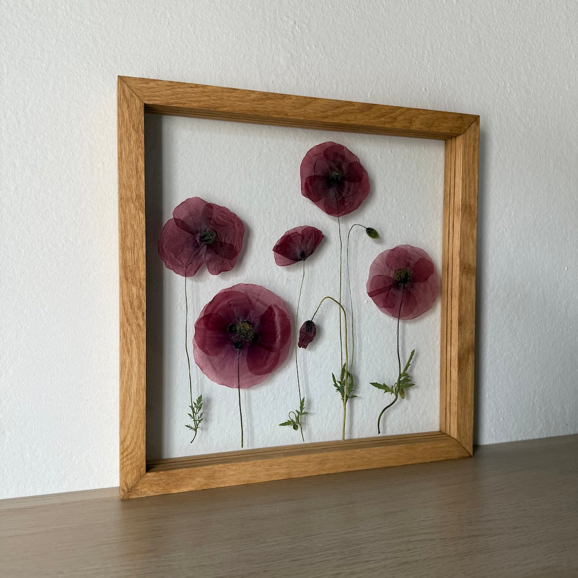 Květinový ručně vyrobený obraz s květy máků, které rostou ze středu obrazu.