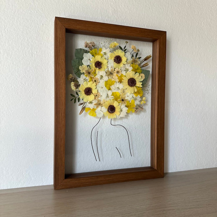 Květinový ručně vyrobený obraz s originální malovanou siluetou s květy v žlutých a bílých barvách.