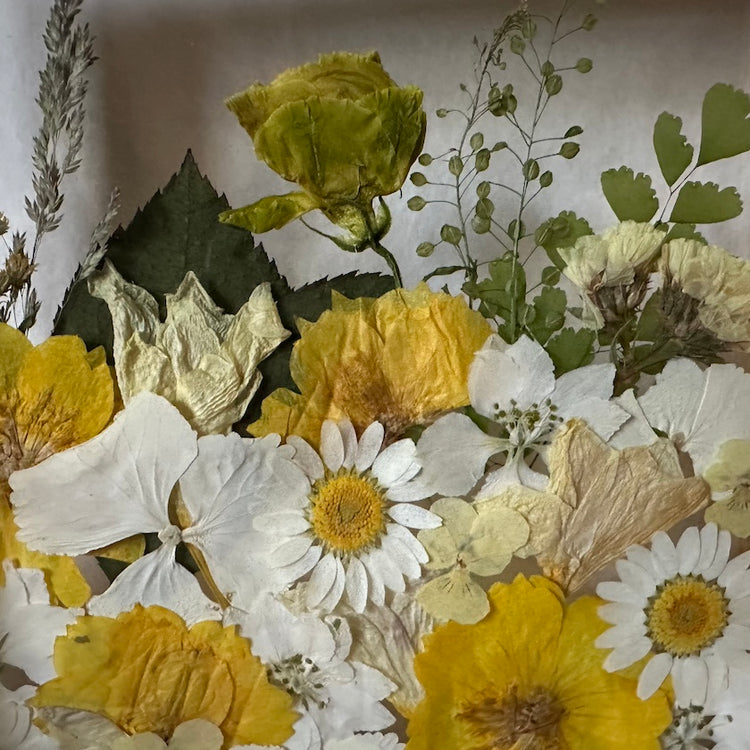 Květinový ručně vyrobený obraz s květy žlutých a bílých barviček, které rostou zespodu obrazu. Mezi květy najdete hortenzie, chryzantému, ostrožky a mnoho dalšího.