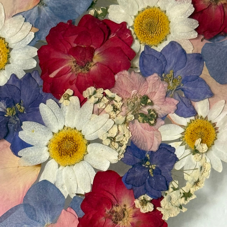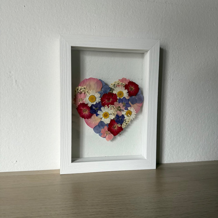 Květinový ručně vyrobený obraz s květy v červených, modrých a růžových barvách, které rostou do tvaru srdce. Mezi květy najdete růže, ostrožky, kopretiny a mnoho dalšího.