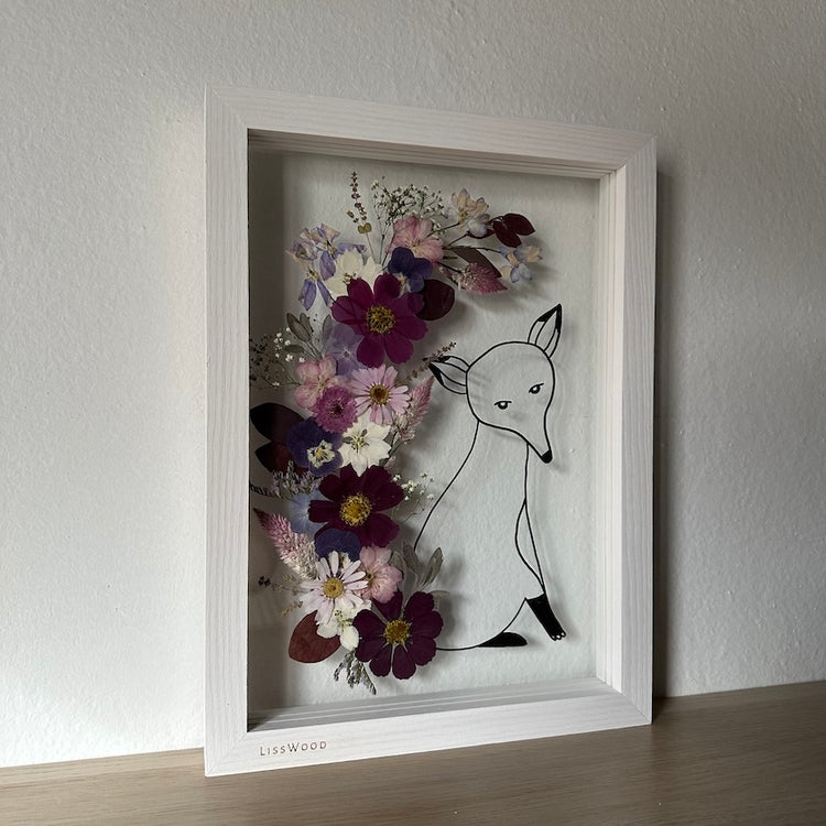 Květinový ručně vyrobený obraz s ručně nakreslenou siluetou zvířátka. Liška s rozkvetlým ocasem z pravých květů zahřeje u srdce každého milovníka zvířecí a květinové říše. Pro malé i velké.