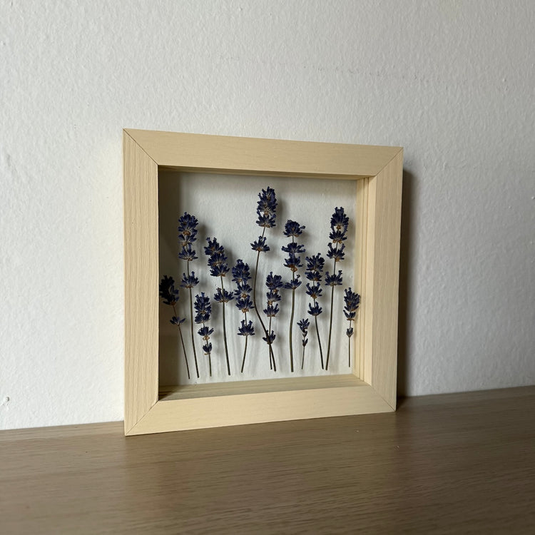 Květiny jsou zasazeny mezi skla a doplněny ručně vyráběným dřevěným rámem, který vzniká přímo v naší dílně. 🪵