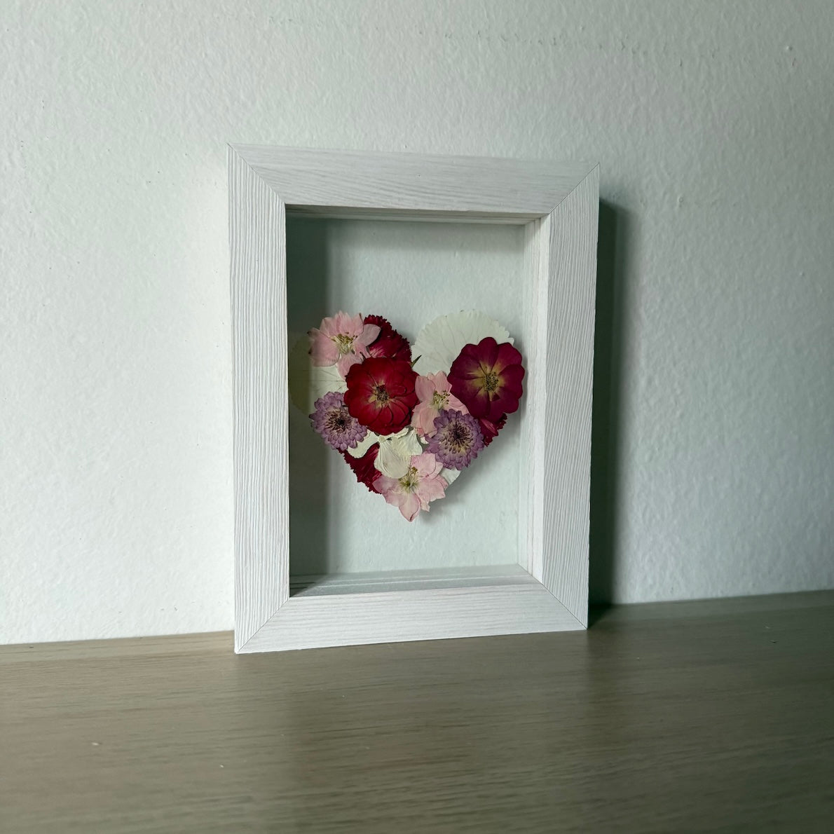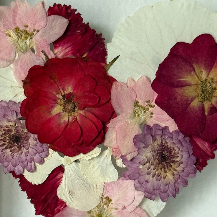 Květinový ručně vyrobený obraz s květy růžových a červených barviček, které rostou ve tvaru srdce ze středu obrazu. Mezi květy najdete růže, ostrožky a mnoho dalšího.