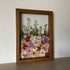 Květinový ručně vyrobený obraz s květy ve fialových a modrých barvách, které rostou ze spodu obrazu. Mezi květy najdete krásenky, ostrožky, jiřiny a mnoho dalšího.