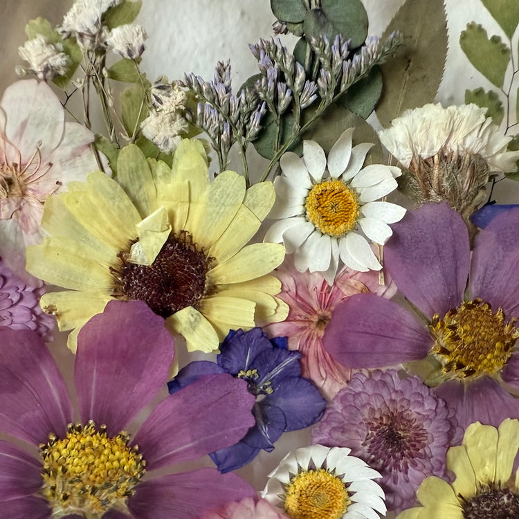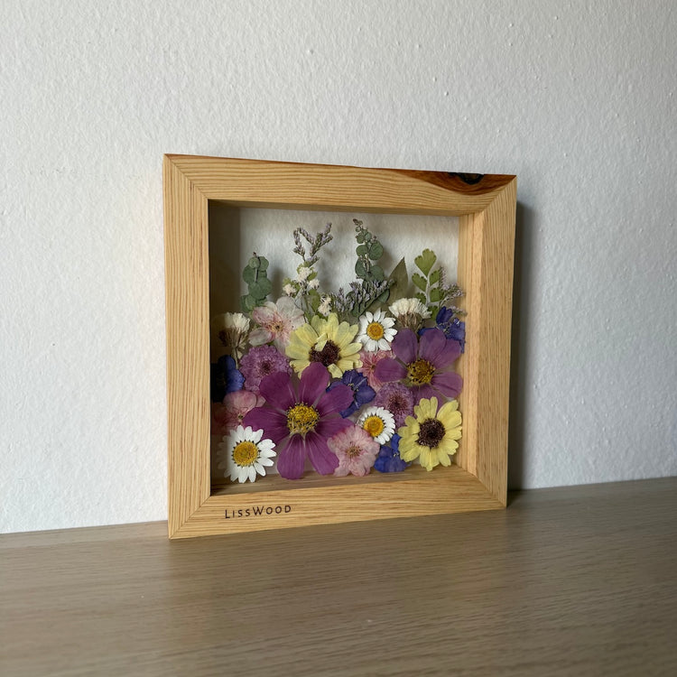 Květinový ručně vyrobený obraz s květy žlutých, fialových a modrých barviček, které rostou ze spodu obrazu. Mezi květy najdete krásenky, chryzantému, ostrožky a mnoho dalšího.