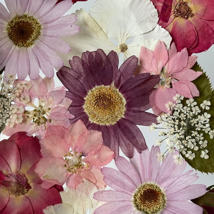 Květinový ručně vyrobený obraz s květy v růžových, bílých a červených barvách, které rostou ze středu obrazu. Mezi květy najdete ostrožky, růže a mnoho dalšího.