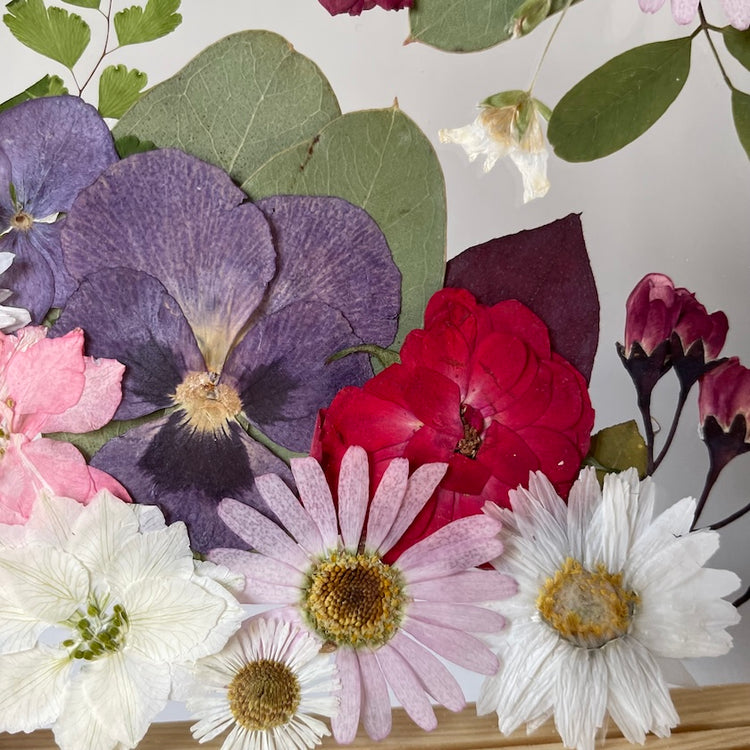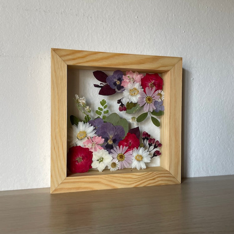 Květiny jsou zasazeny mezi skla a doplněny ručně vyráběným dřevěným rámem, který vzniká přímo v naší dílně. 🪵