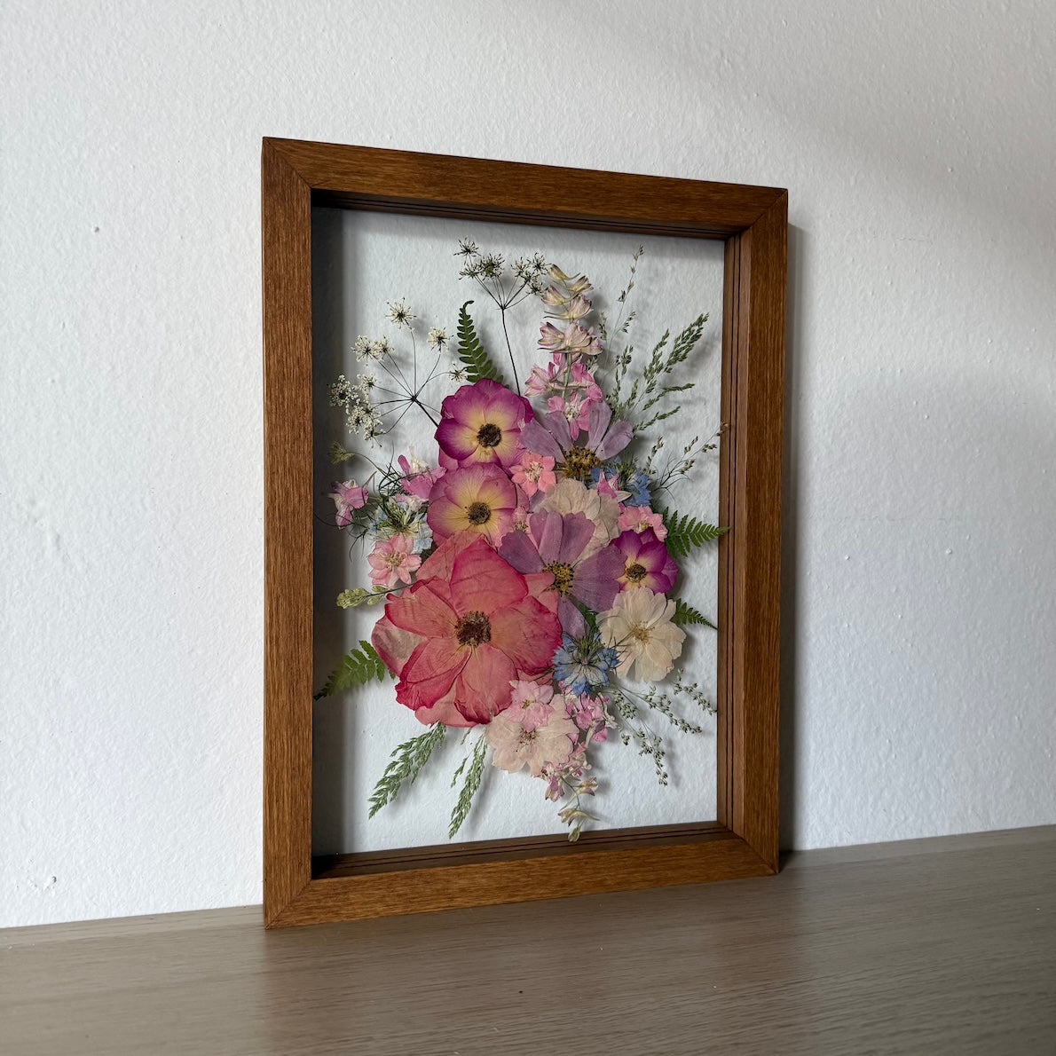 Květiny jsou zasazeny mezi skla a doplněny ručně vyráběným dřevěným rámem, který vzniká přímo v naší dílně. 🪵