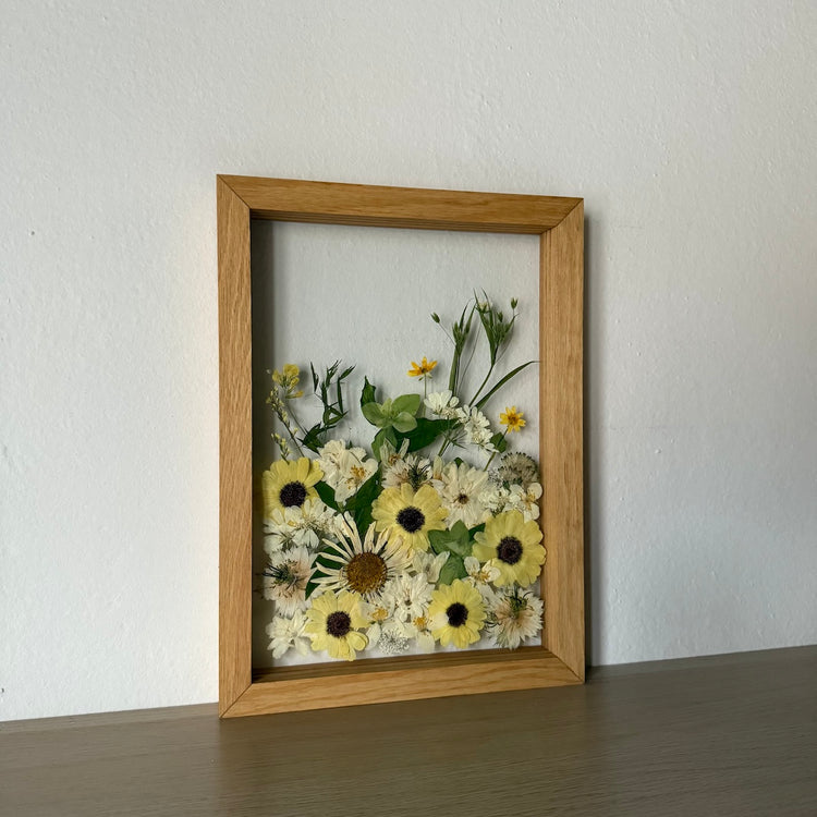Květinový ručně vyrobený obraz s květy v žlutých a bílých barvách, které rostou ze spodu obrazu. Mezi květy najdete jasmín, černuchy, paprsku a mnoho dalšího.