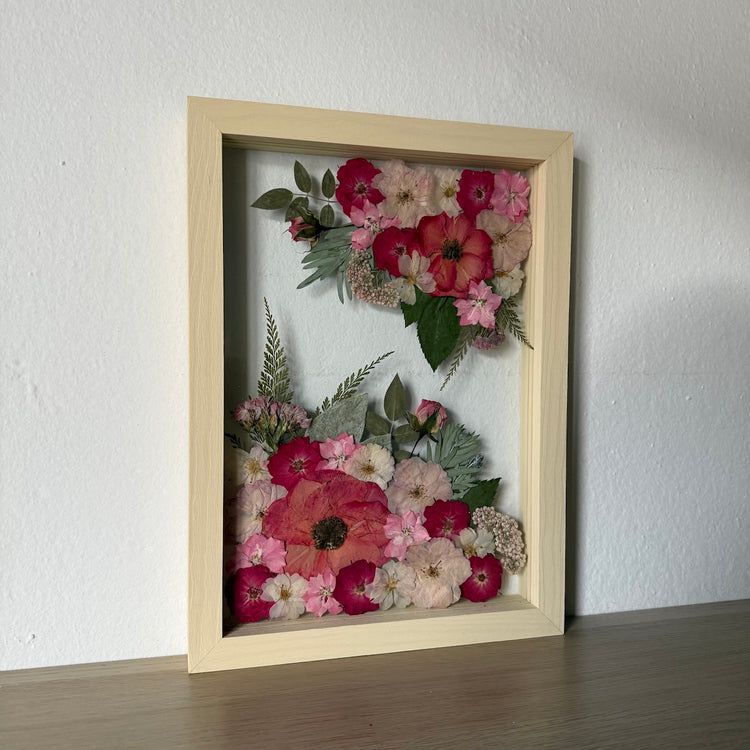 Květiny jsou zasazeny mezi skla a doplněny ručně vyráběným dřevěným rámem, který vzniká přímo v naší dílně. 🪵