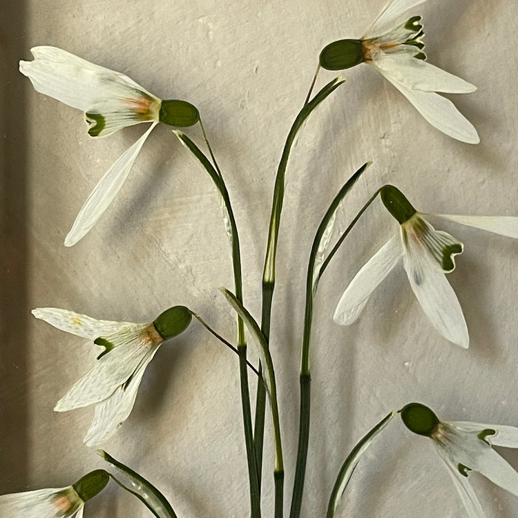 Květinový ručně vyrobený obraz s květy sněženek, které rostou ze středu obrazu.