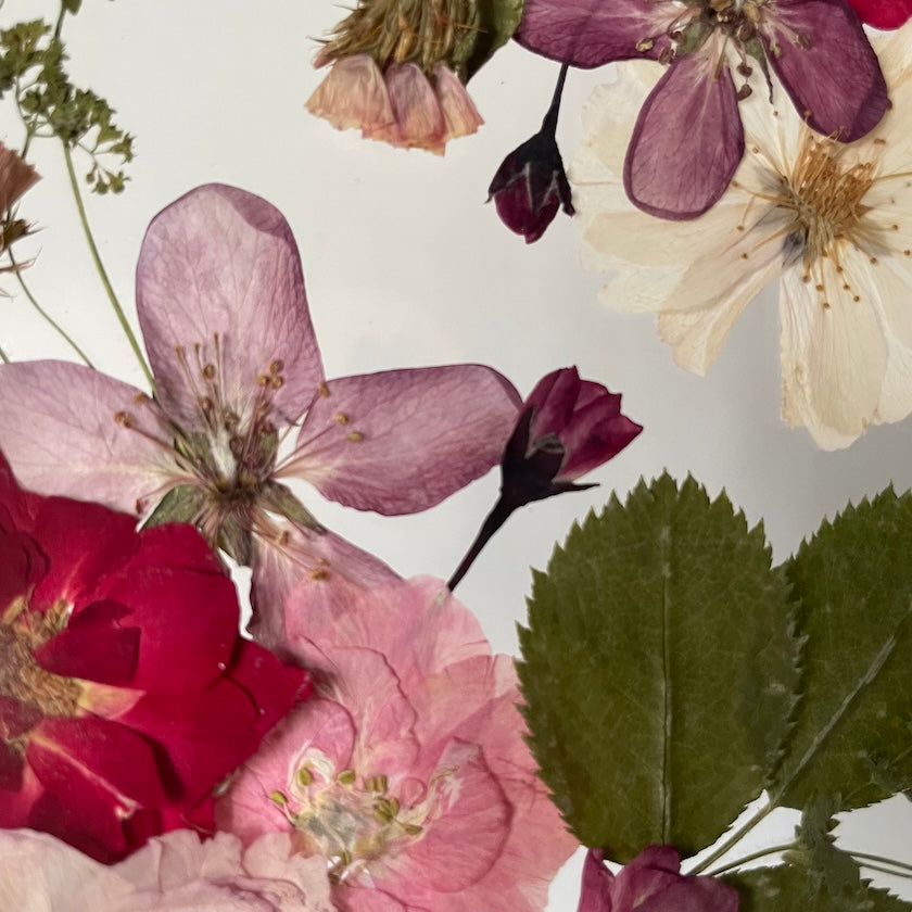 Květinový ručně vyrobený obraz s květy růžových a červených barev, které rostou z rohů obrazu. Mezi květy najdete ostrožku, květy třešní, růži a mnoho dalšího.