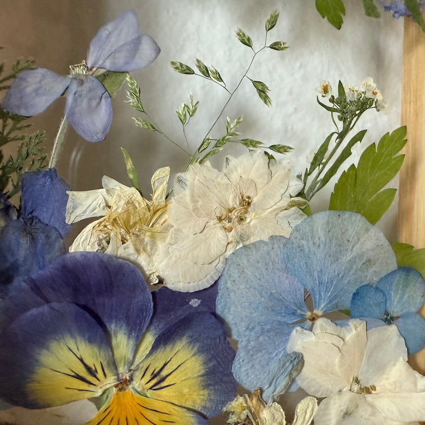 Květinový ručně vyrobený obraz s květy bílých a modrých barev, které rostou z rohů obrazu. Mezi květy najdete macešku, hortenzie, ostrožky a další.