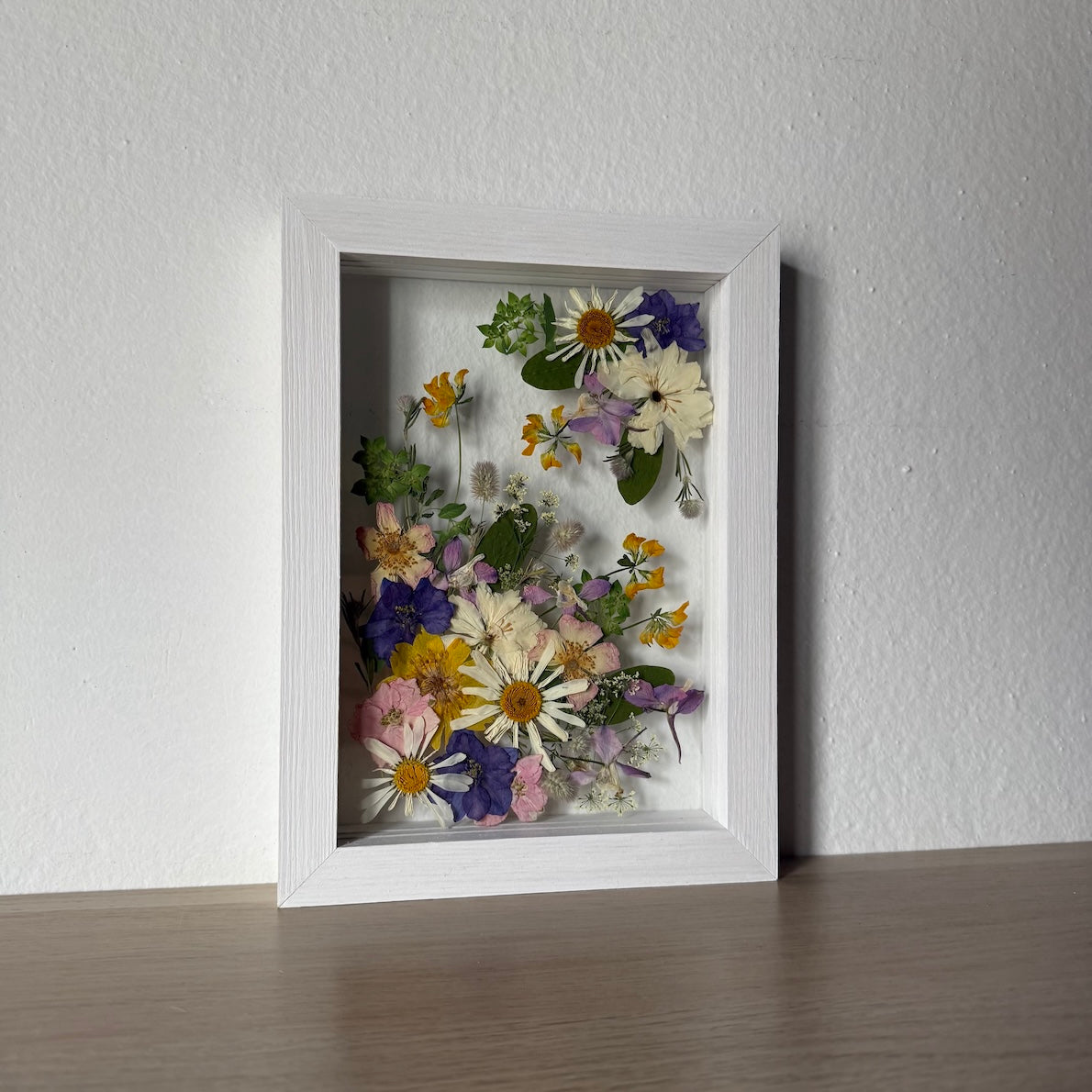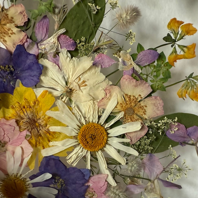 Květinový ručně vyrobený obraz s květy v růžových, žlutých a modrých barvách, které rostou z rohů obrazu. Mezi květy najdete kopretiny, růže, ostrožky a mnoho dalšího.