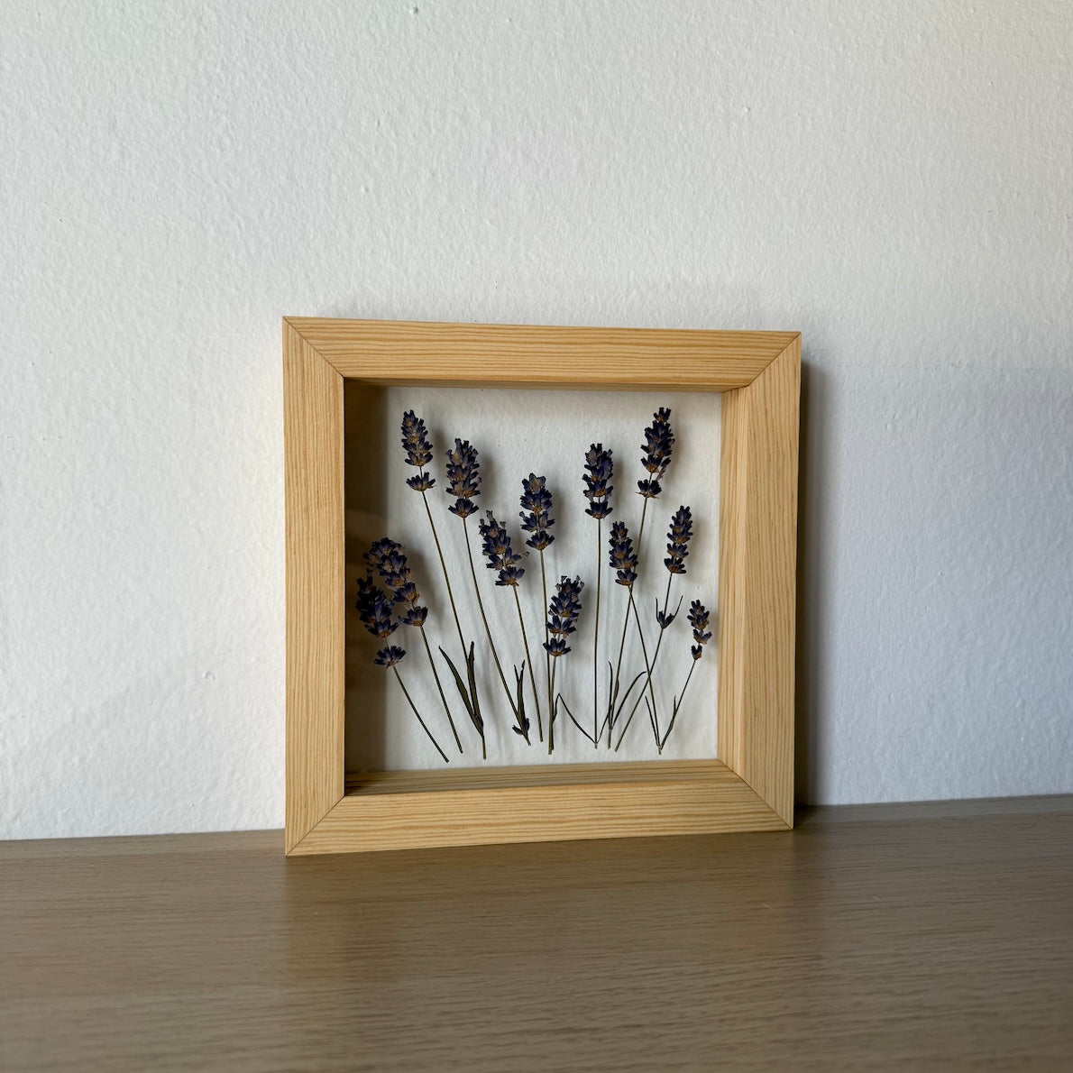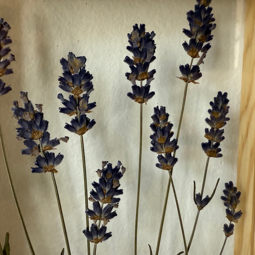 Květinový ručně vyrobený obraz s květy levandule, které rostou ze středu obrazu.
