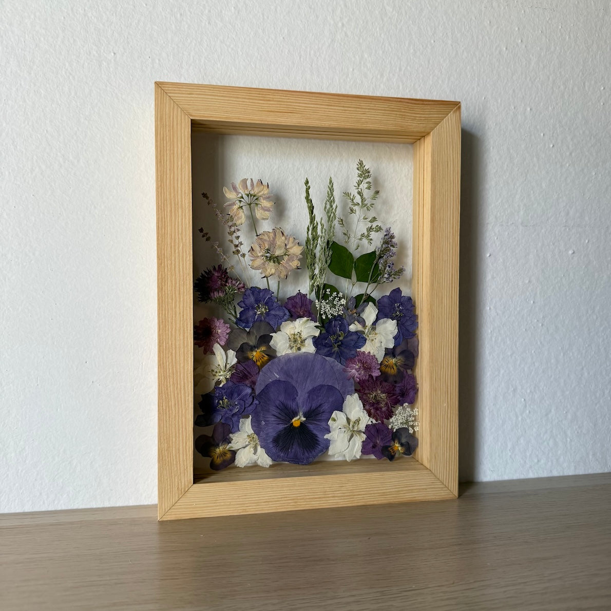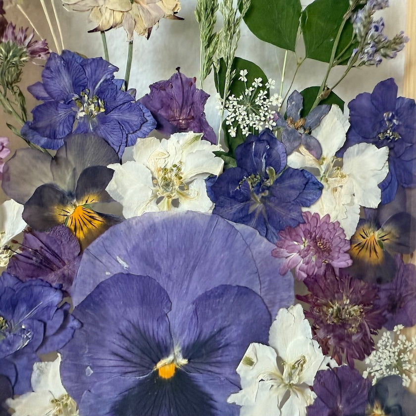 Květinový ručně vyrobený obraz s květy v modrých, fialových a bílých barvách, které rostou ze spodu obrazu. Mezi květy najdete statici, ostrožky, macešky a mnoho dalšího.