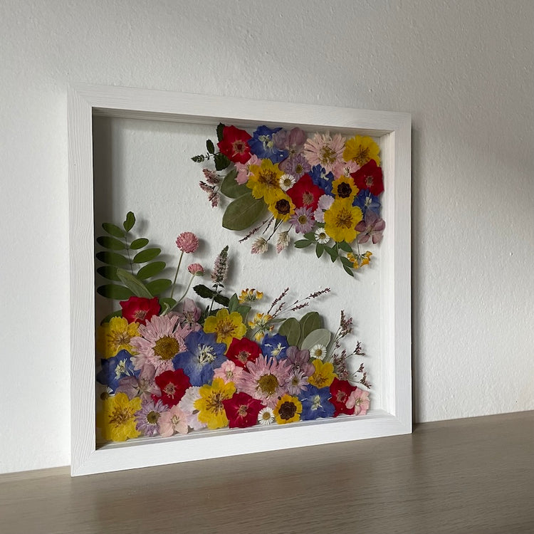 Květinový ručně vyrobený obraz s květy v růžových, žlutých a fialových barvách, které rostou z rohů obrazu. Mezi květy najdete krásnoočka, růže, ostrožky a mnoho dalšího.