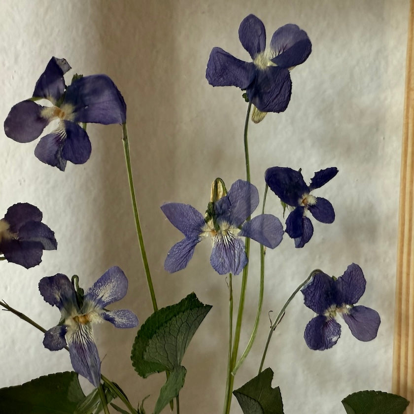 Květinový ručně vyrobený obraz s květy fialek, které rostou ze středu obrazu.