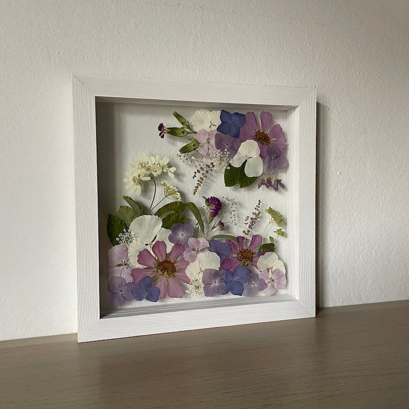 Květinový ručně vyrobený obraz s květy v bílých a fialových barvách, které rostou z rohů obrazu. Mezi květy najdete hortenzie, krásenku a mnoho dalšího.