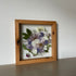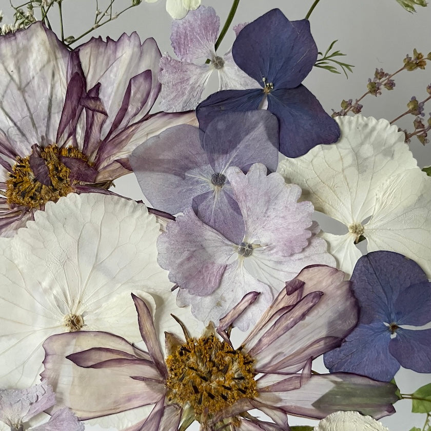 Květinový ručně vyrobený obraz s květy v bílých a fialových barvách, které rostou ze středu obrazu. Mezi květy najdete hortenzie, krásenku a mnoho dalšího.