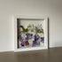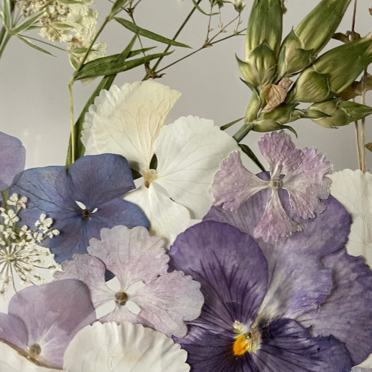 Květinový ručně vyrobený obraz s květy v bílých a fialových barvách, které rostou ze spodu obrazu. Mezi květy najdete hortenzie, krásenku, macešky a mnoho dalšího.