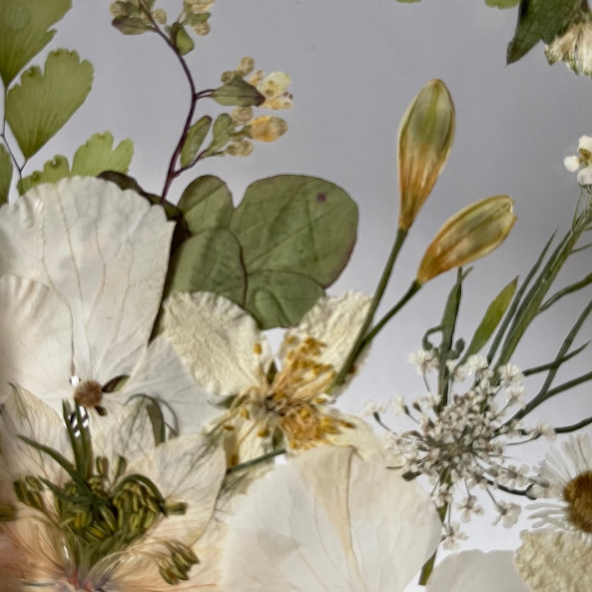 Květinový ručně vyrobený obraz s květy bílých barev, které rostou z rohů obrazu. Mezi květy najdete černuchy, hortenzie a mnoho dalšího.