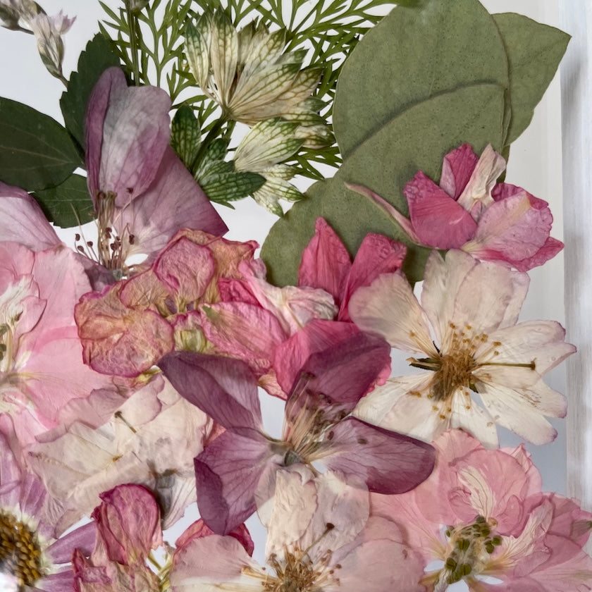Květinový ručně vyrobený obraz s květy růžových a bílých barev, které rostou ze spodu obrazu. Mezi květy najdete ostrožku, květy třešní a mnoho dalšího.