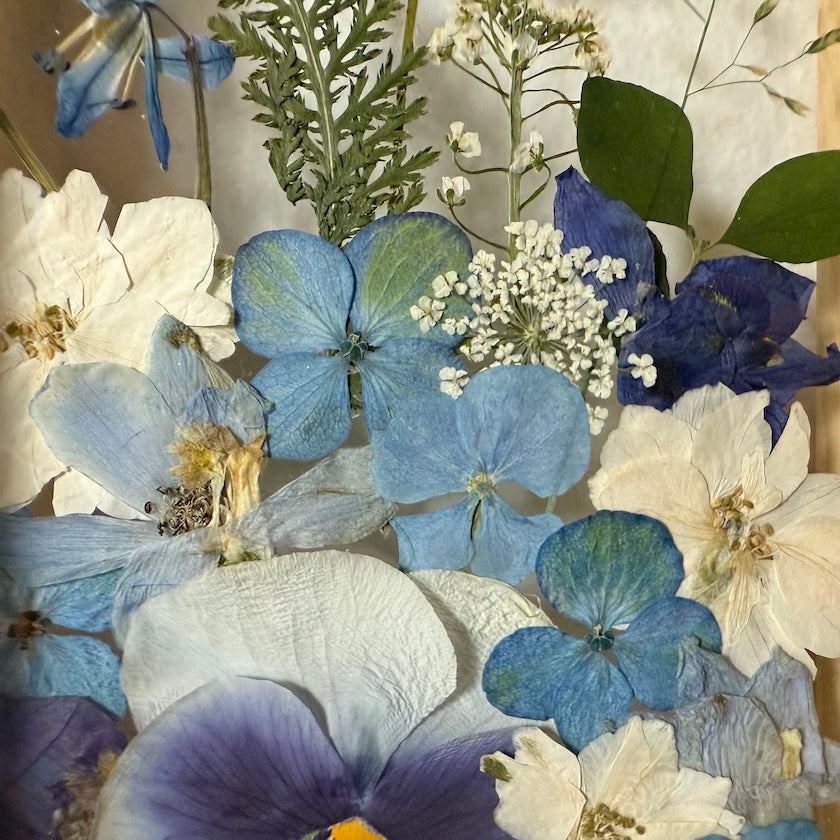 Květinový ručně vyrobený obraz s květy bílých a modrých barev, které rostou ze spodu obrazu. Mezi květy najdete hortenzie, ostrožky a další.