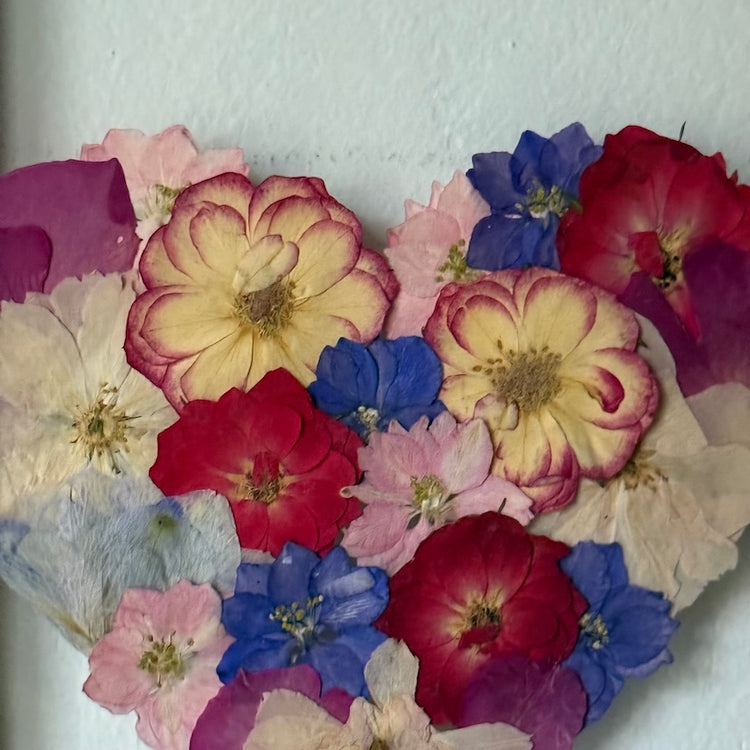 Květinový ručně vyrobený obraz s květy v červených barvách, které rostou do tvaru srdce. Mezi květy najdete růže, ostrožky, heřmánek a mnoho dalšího.