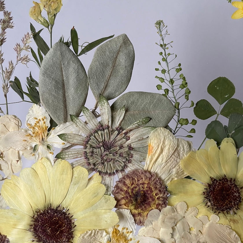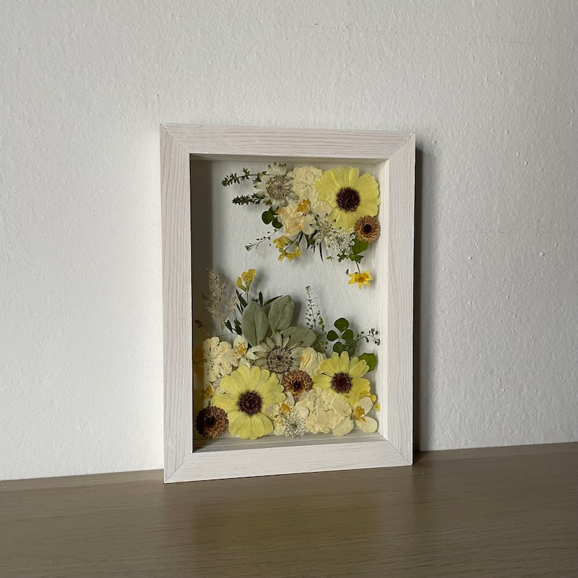 Květinový ručně vyrobený obraz s květy ve žlutých a bílých barvách, které rostou z rohů obrazu. Mezi květy najdete jasmín, chryzantémy, hortenzie a mnoho dalšího.