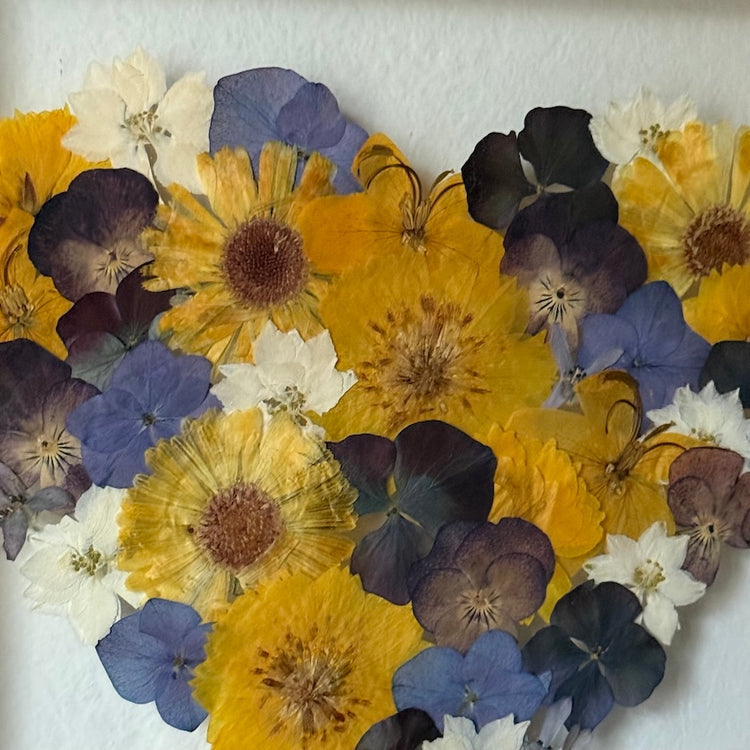 Květinový ručně vyrobený obraz s květy ve žlutých a fialových barvách, které rostou do tvaru srdce. Mezi květy najdete krásnoočka, měsíček a mnoho dalšího.