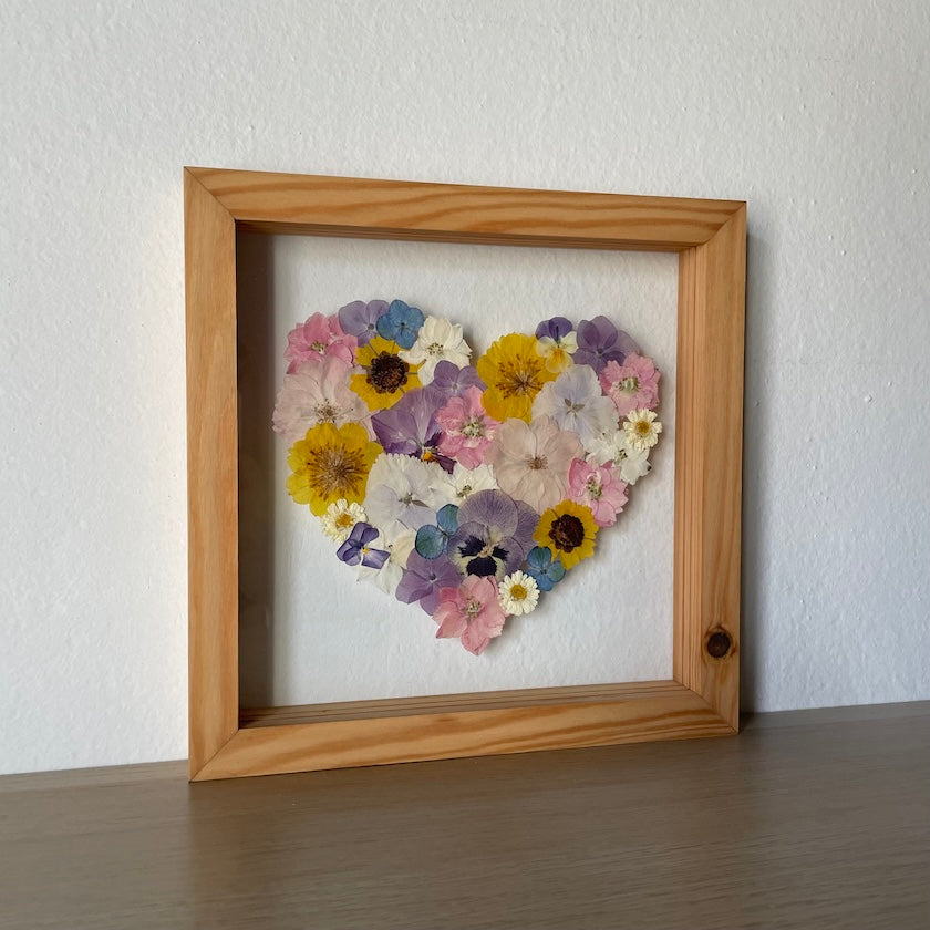 Květinový ručně vyrobený obraz s květy ve žlutých, růžových a fialových barvách, které rostou ve tvaru srdce ze středu obrazu. Mezi květy najdete krásnoočka, macešky, ostrožky a mnoho dalšího.