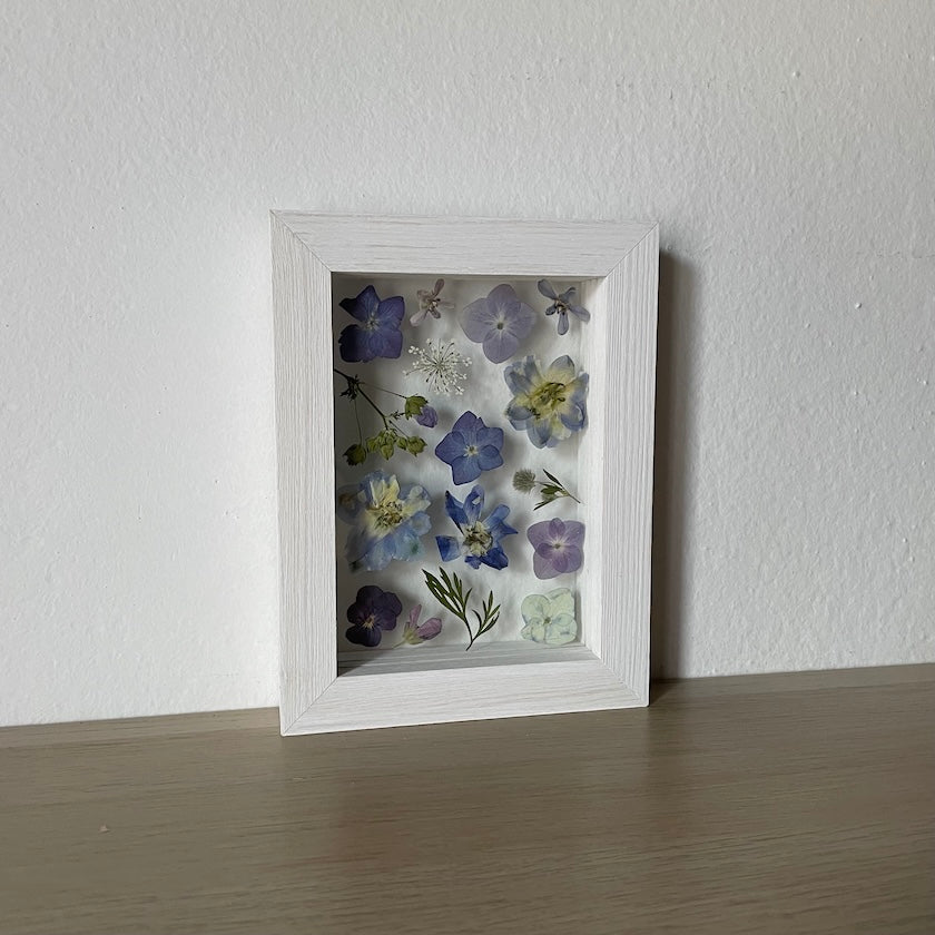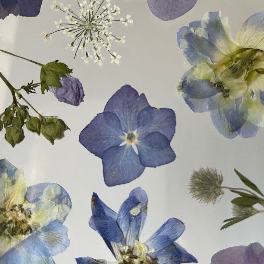 Květinový ručně vyrobený obraz s květy bílých a modrých barev, které rostou po celém obrazu. Mezi květy najdete hortenzii, ostrožky a další.
