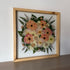 Květinový ručně vyrobený obraz s květy v růžových, bílých a oranžových barvách, které rostou ze středu obrazu. Mezi květy najdete květy tulipánů, hlaváče, růže a mnoho dalšího.