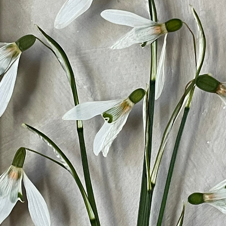 Květinový ručně vyrobený obraz s květy sněženek, které rostou ze středu obrazu.