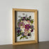 Květinový ručně vyrobený obraz s květy v modrých, fialových a bílých barvách, které rostou ze středu obrazu. Mezi květy najdete ostrožky, krásenky, růže a mnoho dalšího.