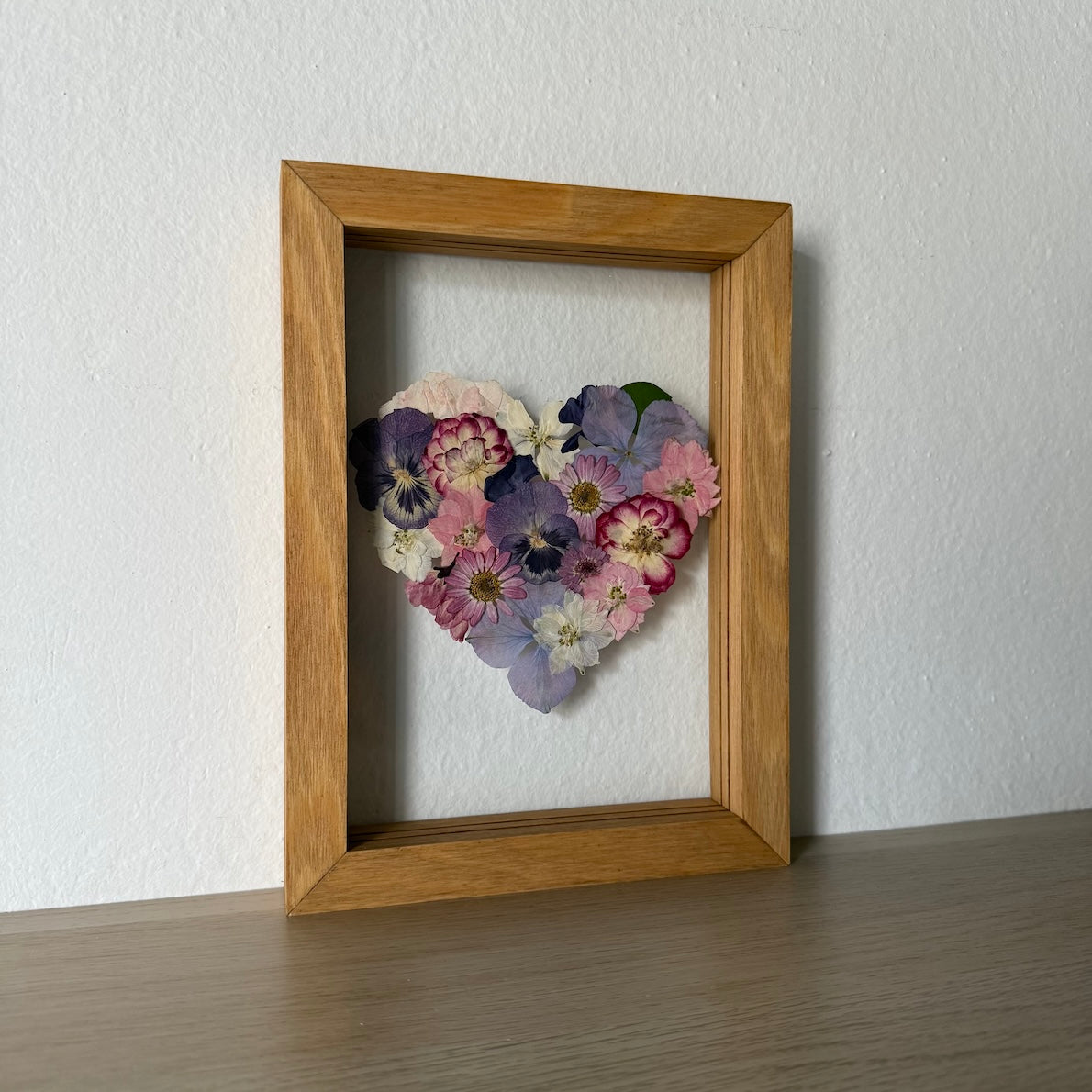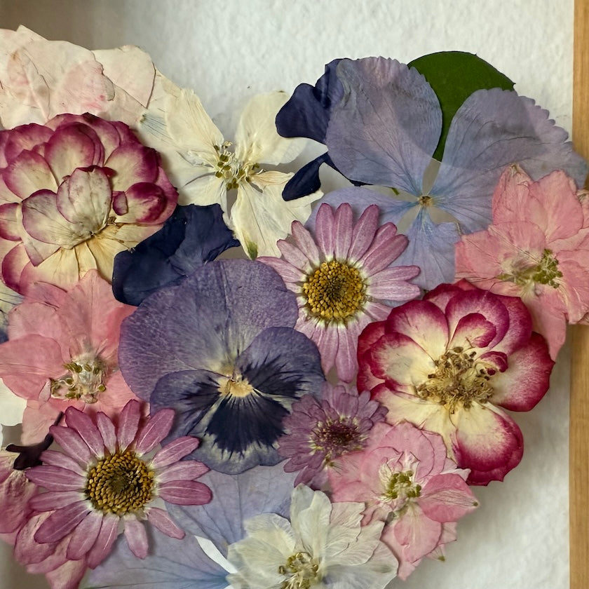 Květinový ručně vyrobený obraz s květy v růžových, fialových a modrých barvách, které rostou ve tvaru srdce ze středu obrazu. Mezi květy najdete květy třešní, macešky, ostrožky a mnoho dalšího.