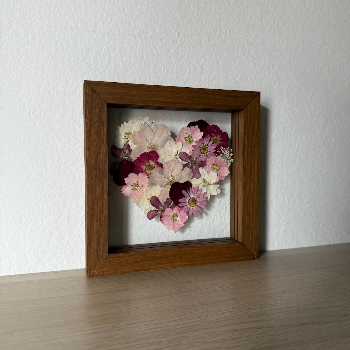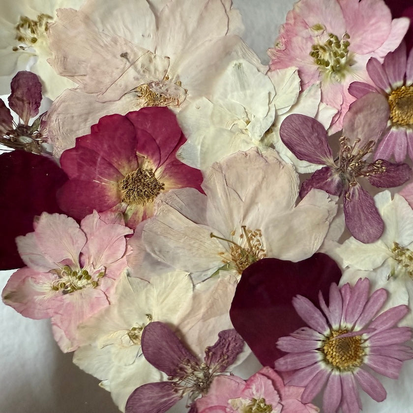 Květinový ručně vyrobený obraz s květy růžových, červených a bílých barviček, které rostou ve tvaru srdce. Mezi květy najdete růže, ostrožky a mnoho dalšího.
