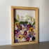 Květinový ručně vyrobený obraz s květy ve žlutých, fialových a modrých barvách, které rostou ze spodu obrazu. Mezi květy najdete krásenky, ostrožky, květy třešní a mnoho dalšího.