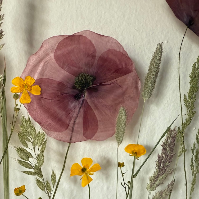 Květinový ručně vyrobený obraz s květy máků a pryskyřníků, které rostou ze středu obrazu.